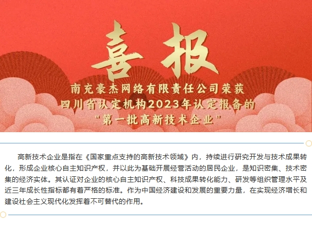 喜報(bào)|南充豪杰網(wǎng)絡(luò)有限責(zé)任公司榮獲四川省認(rèn)定機(jī)構(gòu)2023年認(rèn)定報(bào)備的“第一批高新技術(shù)企業(yè)”